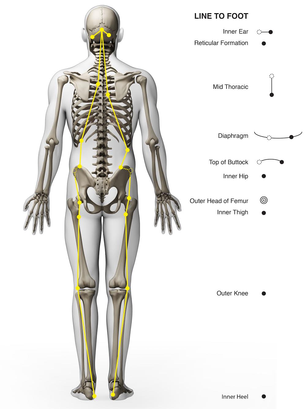 Inner ears - reticular formation - mid thoracic - diaphragm - top of the buttocks - inner hip bone - outer head of the femur - inner top of thigh bone - outer knee to inner center of the heel bone.