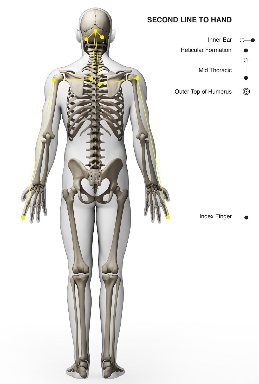 Inner ear - reticular formation - mid thoracic - outer top head of the humerus to the index finger.