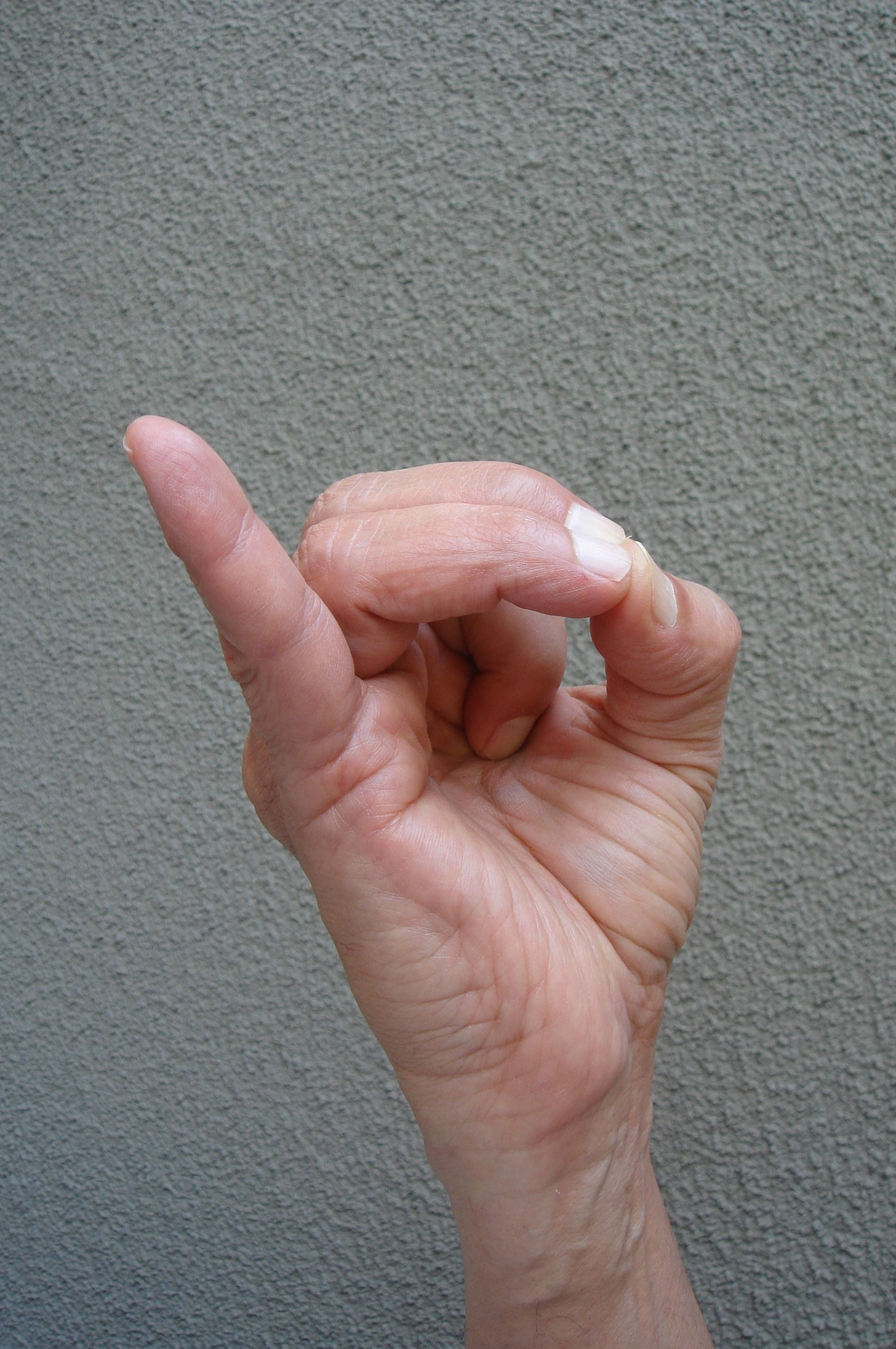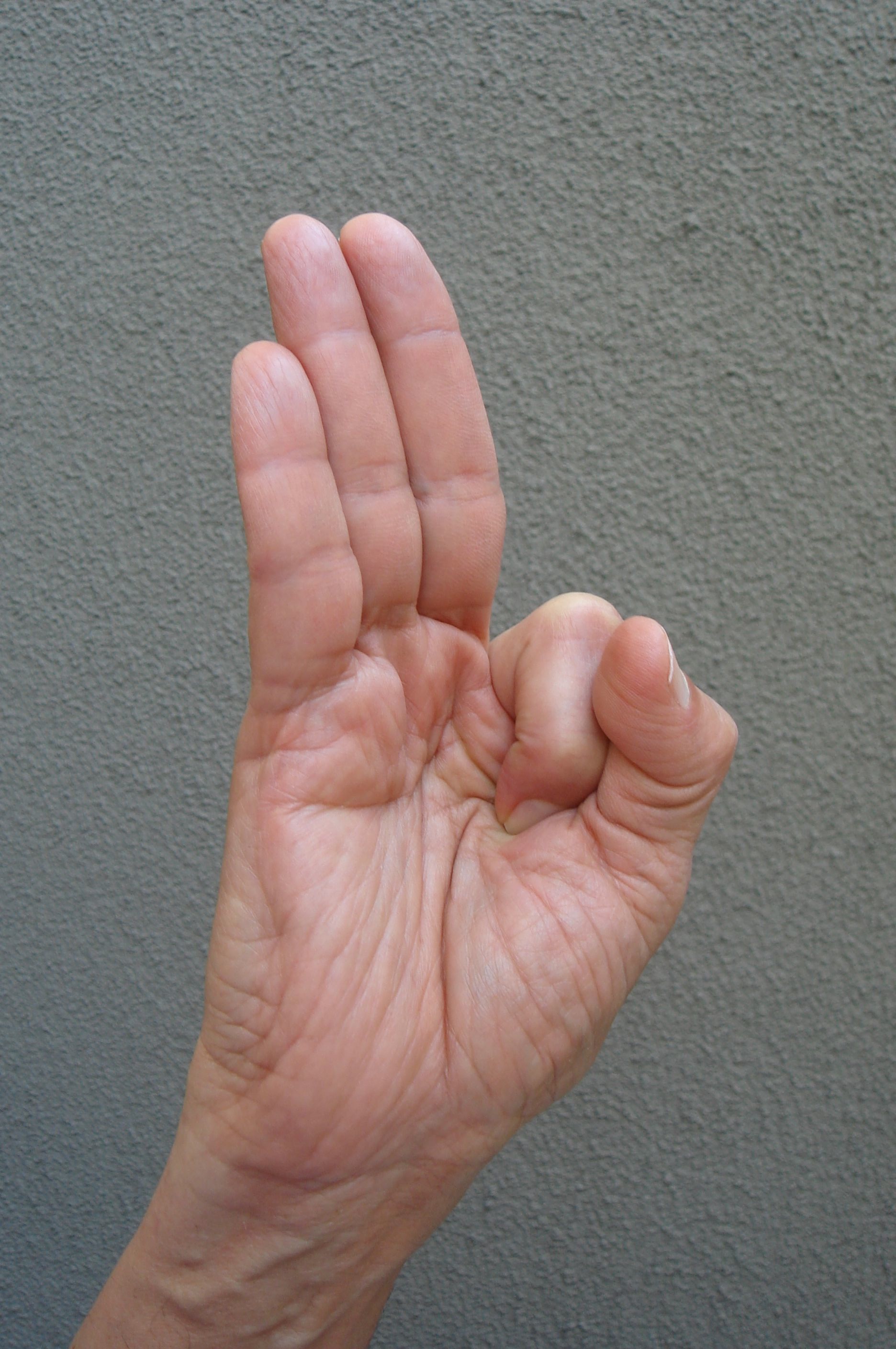Bend index finger to touch base of thumb; tips of middle and ring fingers touch tip of